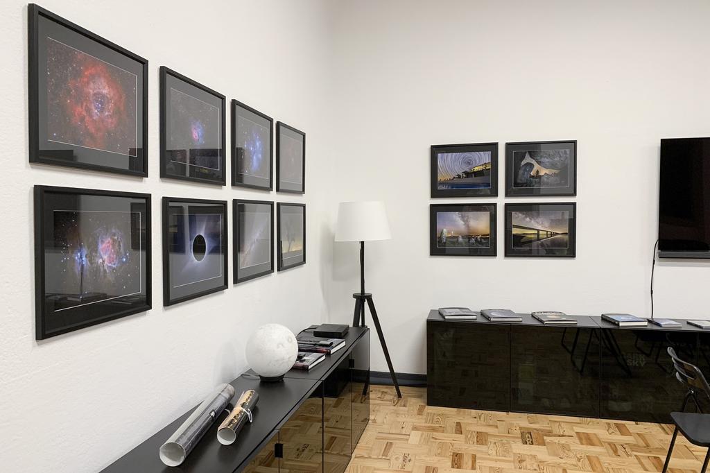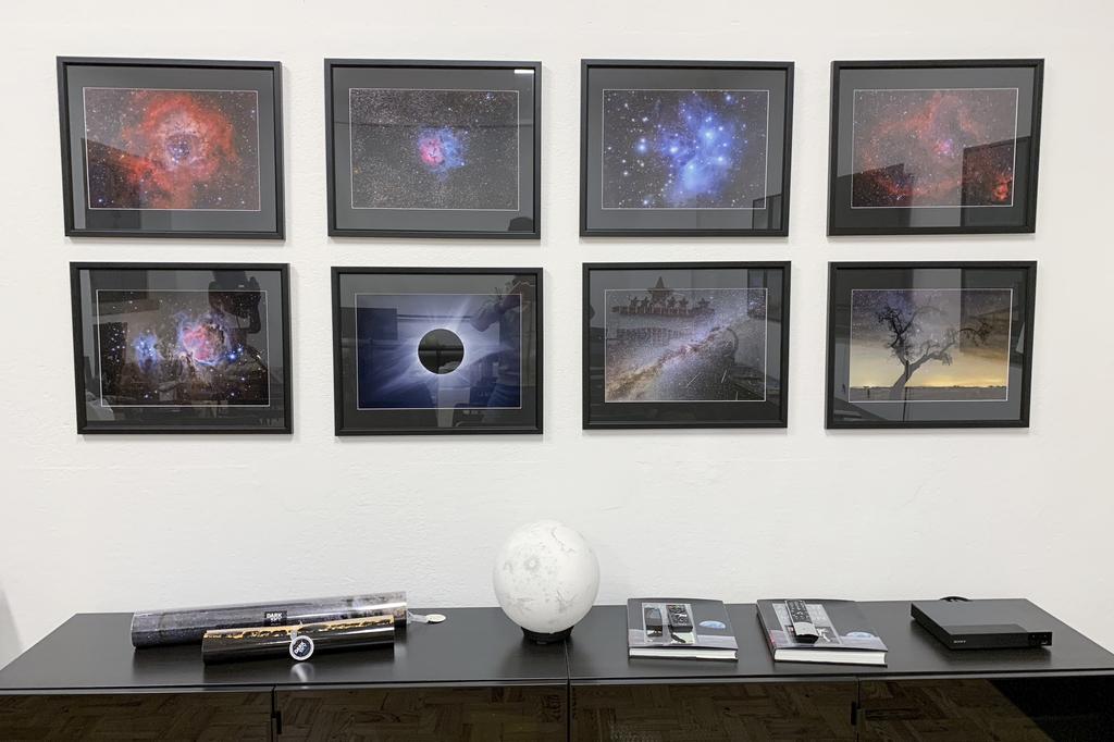 No hall exterior, uma seleção de 12 astrofotografias de grande formato, também da autoria de Miguel Claro, prolonga a experiência visual e cria uma transição natural entre o espaço expositivo e o céu real que se estende lá fora.