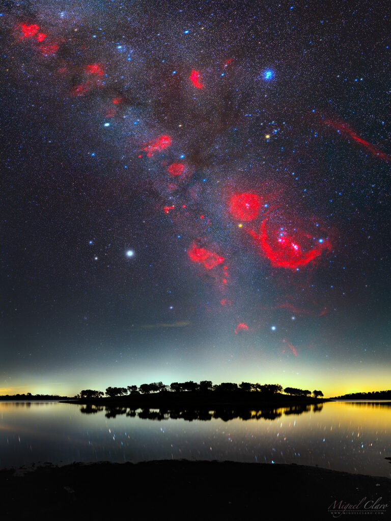 A Nightscape Reveals the Ha emission along the path of Winter Milky Way Shining above Alqueva Lake