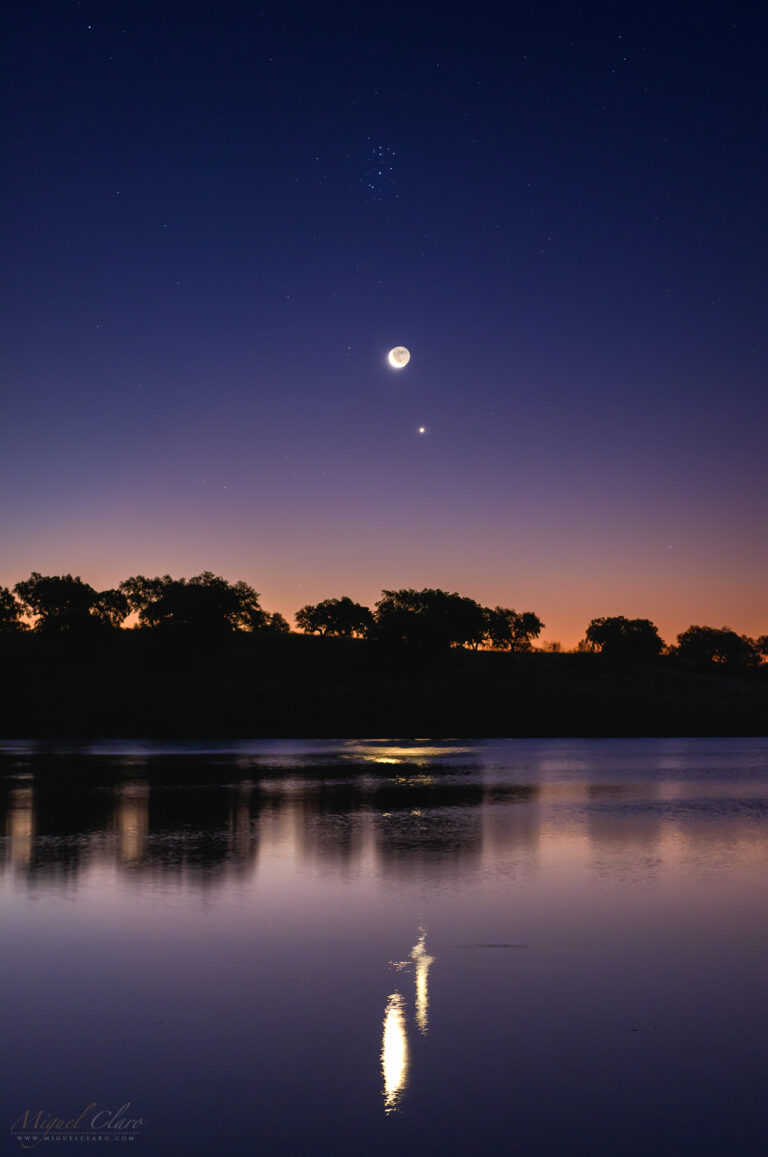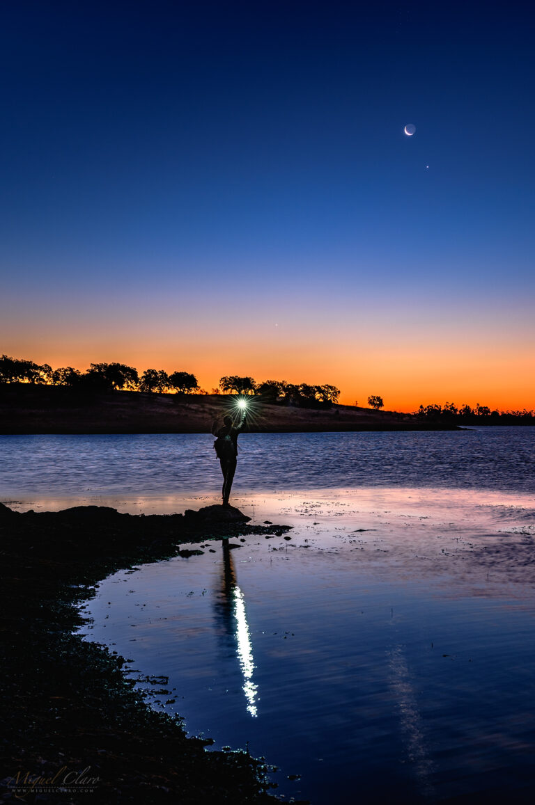 A Stargazer with Mercury, Venus, Moon and Pleiades above Alqueva Lake