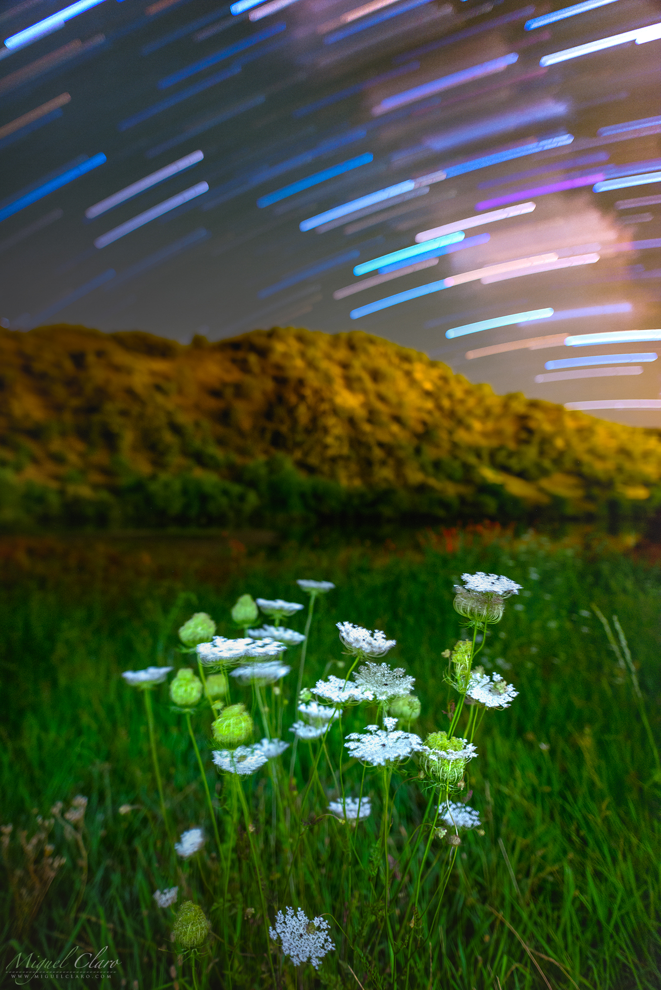 An Over Extended Spring Shows Colorful Light Paths above Green Fields and White Flowers