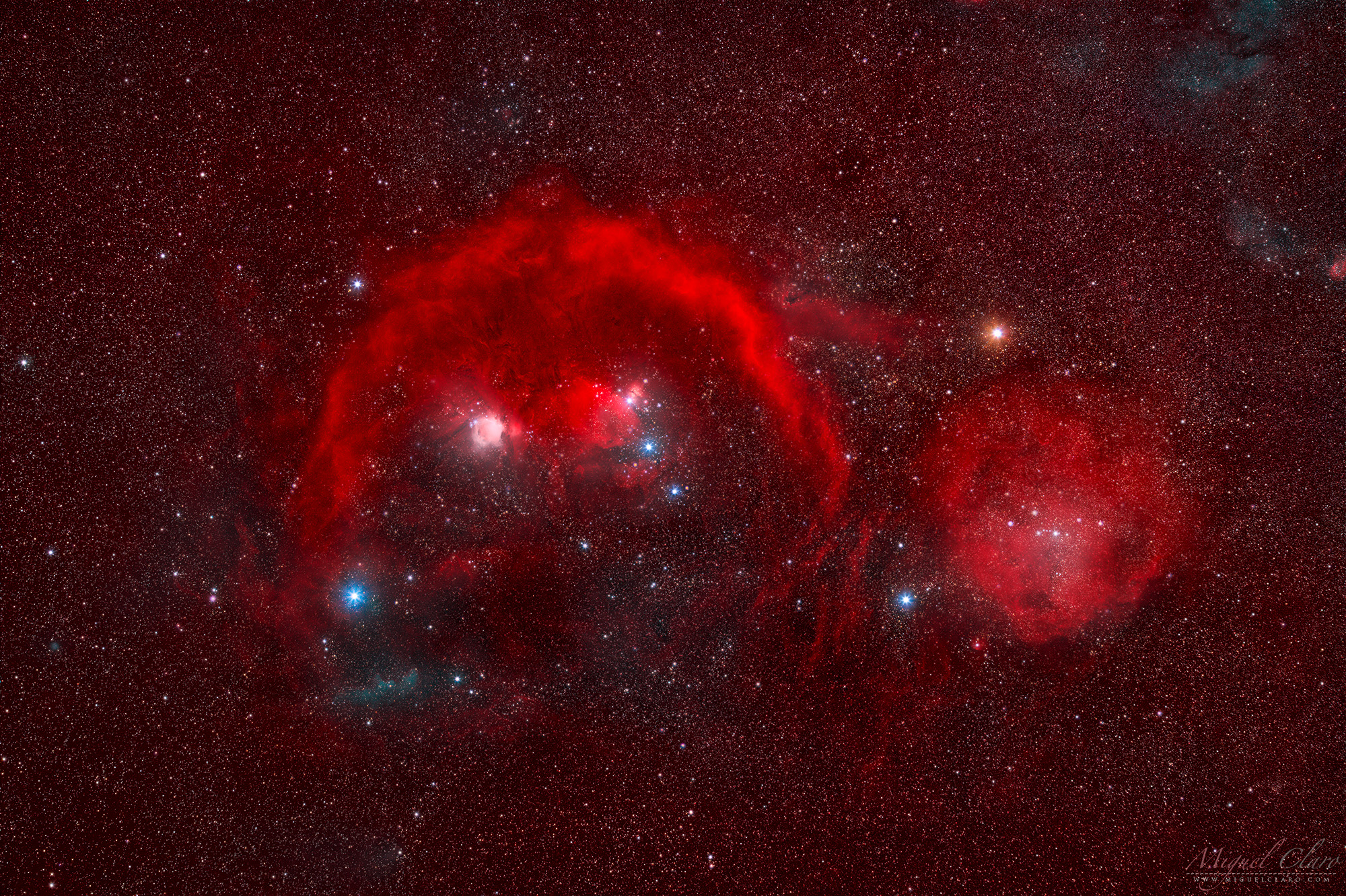 Deep Wide View of Orion Constellation Immersed in a Giant Reddish Cloud of Hydrogen
